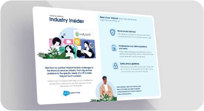 Here’s how Vidyard helps financial services FINANCIAL SERVICES organizations like yours. Industry Insider Stand out and build trust. With Vidyard, you can create and send personalized videos to build the authentic human connections that clients crave. Modernize the way clients experience your brand. Vidyard helps you leverage your branded video content to expand your message’s reach, and use in-video calls to action to push viewers down your funnel right away. Satisfy privacy guidelines. See how our partner Vidyard tackles challenges in Vidyard allows you to share sensitive video content with the financial services industry. From big-picture the confidence that it’s protected by the right security, problems to the specific needs of a VP of sales, user permissions, and compliance measures. Vidyard has it covered. Vidyard’s video messaging and hosting solutions help financial services firms modernize the way they create and nurture relationships with their clients. Keep reading to learn how Vidyard could help a VP of sales use video to add that crucial personal touch to their company’s virtual communications.