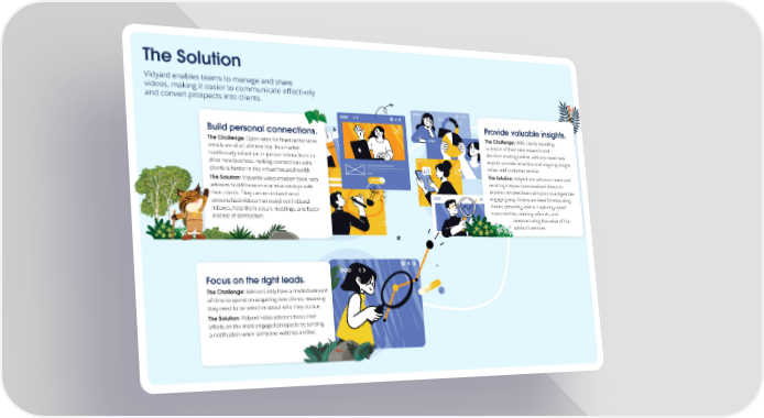 The Solution Vidyard enables teams to manage and share videos, making it easier to communicate effectively and convert prospects into clients. Provide valuable insights. Build personal connections. The Challenge: With clients handling The Challenge: Open rates for financial services so much of their own research and emails are at an all-time low. In a market decision-making online, advisors need new traditionally reliant on in-person interactions to ways to provide proactive and ongoing insight, drive new business, making connections with value, and customer service. clients is harder in this virtual-focused world. The Solution: Vidyard lets advisors create and The Solution: Vidyard’s video creation tools help send high-impact personalized videos to advisors build those crucial relationships with explain complex financial topics in a digestible, their clients. They can record and send engaging way. Videos are ideal for educating personalized videos that stand out in bland clients, providing advice, capturing upsell inboxes, help them secure meetings, and foster opportunities, winning referrals, and a sense of connection. demonstrating the value of the advisor's services. Focus on the right leads. The Challenge: Advisors only have a limited amount of time to spend on acquiring new clients, meaning they need to be selective about who they pursue. The Solution: Vidyard helps advisors focus their efforts on the most engaged prospects by sending a notification when someone watches a video.