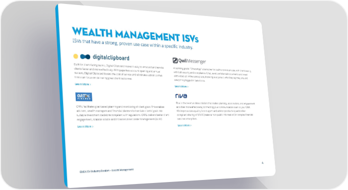 Wealth Management ISVs ISVs that have a strong, proven use case within a specific industry. Built for client-facing teams, Digital Clipboard makes it easy to onboard and service A banking grade “WhatsApp” alternative for staff to communicate with clients easily, clients faster and more effectively. With paperless account opening and annual with full security and compliance. Chat, send confidential documents and meet reviews, Digital Clipboard lowers the cost of service and eliminates admin so that with video all in the same place, knowing everyone is who they say they are, and firms can focus on delivering great client outcomes. everything logged in Salesforce. Learn More > Learn More > Riva is the revenue data solution that makes planning, acceleration, and engagement OPAL facilitates goal-based planning and monitoring of client goals. This enables activities more effective by connecting your communication stack to your CRM. advisors, wealth managers and financial planners to translate clients’ goals into We improve data quality, boost agent and advisor productivity and deliver suitable investment decisions compliant with regulations. OPAL delivers better client compliant sharing of MNPI (material non-public information) in complex financial engagement, scalable advice and increases Asset Under Management (AUM). services enterprises. Learn More > Learn More > EMEA ISV Industry Booklet — Wealth Management 4