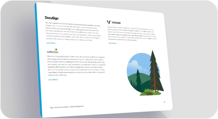 DocuSign Agreement Cloud for Salesforce helps businesses streamline how they Vonage Contact Center for Salesforce is the 100% native global business cloud prepare, sign, act on and manage vital documents such as loan agreements, telephony system for the world’s leading CRM platform. The highest rated voice retail contracts, and risk and liability forms - all integrated with Salesforce. With solution (over 730 five-star reviews) on the AppExchange, it enables personalized DocuSign, organisations can do business faster with less risk, lower costs, and client relationships at enterprise scale, super-charges agent productivity from white better experiences for customers, partners, and employees. Today, over a million glove to high volume support, and provides artificial conversation intelligence (AI) to customers and more than a billion users in over 180 countries use DocuSign to enhance every touch point on every interaction. accelerate the process of doing business and simplify people’s lives. Learn More > Learn More > Natterbox is the global solution 100% native on the Salesforce platform. Integrated and managed inside Salesforce, Natterbox’s 5-star CTI and contact centre solution hosts a range of features including IVR, ACD, click-to-dial, call recording, call routing, auto-logging, call coaching, voice transcription and sentiment analysis. By integrating telephony with Salesforce, the Wealth Management industry can help to reduce the cost of overheads by improving efficiency and enable their employees to offer a streamlined, efficient and exceptional advisory service to their clients to help retain and grow their client base. Learn More > APAC ISV Industry Booklet — Wealth Management 6