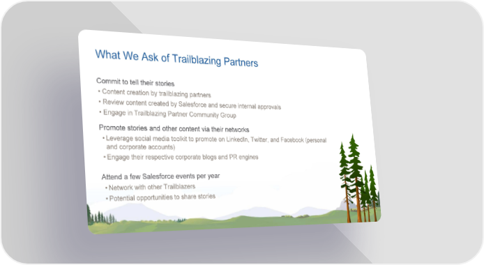 What We Ask of Trailblazing Partners Commit to tell their stories • Content creation by trailblazing partners • Review content created by Salesforce and secure internal approvals • Engage in Trailblazing Partner Community Group Promote stories and other content via their networks • Leverage social media toolkit to promote on LinkedIn, Twitter, and Facebook (personal and corporate accounts) • Engage their respective corporate blogs and PR engines Attend a few Salesforce events per year • Network with other Trailblazers • Potential opportunities to share stories