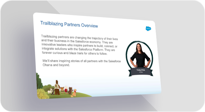 Trailblazing Partners Overview Trailblazing partners are changing the trajectory of their lives and their business in the Salesforce economy. They are innovative leaders who inspire partners to build, connect, or integrate solutions with the Salesforce Platform. They are forever curious and blaze trails for others to follow. We’ll share inspiring stories of all partners with the Salesforce Ohana and beyond. Trailblazer Trisha Price nCino Marketing