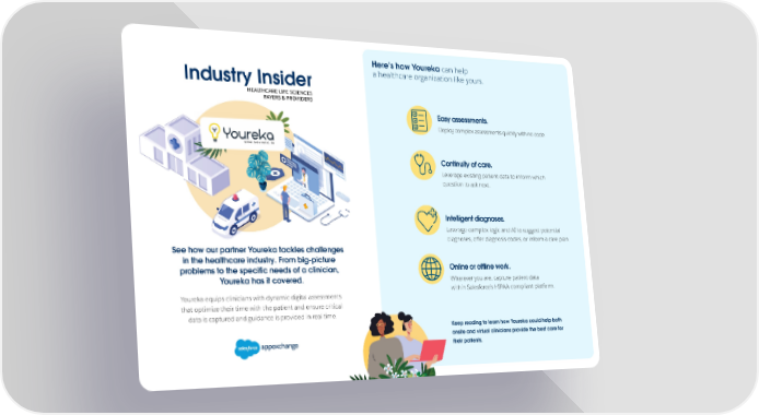 Here’s how Youreka can help Industry Insider a healthcare organization like yours. HEALTHCARE LIFE SCIENCES PAYERS & PROVIDERS Easy assessments. Deploy complex assessments quickly with no code. Continuity of care. Leverage existing patient data to inform which question to ask next. Intelligent diagnoses. Leverage complex logic and AI to suggest potential diagnoses, offer diagnosis codes, or inform a care plan. See how our partner Youreka tackles challenges in the healthcare industry. From big-picture problems to the specific needs of a clinician, Online or offline work. Youreka has it covered. Wherever you are, capture patient data within Salesforce’s HIPAA-compliant platform. Youreka equips clinicians with dynamic digital assessments that optimize their time with the patient and ensure critical data is captured and guidance is provided in real time. Keep reading to learn how Youreka could help both onsite and virtual clinicians provide the best care for their patients.