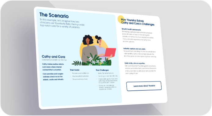 How Youreka Solves The Scenario Cathy and Cora’s Challenges In this example, let’s imagine how two clinicians use Youreka to help them provide Simplify health assessments. top-notch care for a variety of patients. Eliminating duplicative data collection processes allows clinicians to focus on interacting with patients. At-home and virtual visits become better, more actionable experiences for Cathy, Cora, and their patients. Instantly capture and sync data. Because they’re spending less time on complicated note transfers, Cathy and Cora have reduced the Cathy and Cora time they spend on data capture by hours each day. Clinicians at Health On The Go Cathy makes routine visits to Easily scale clinical expertise. rural areas where internet Cathy and Cora love Youreka’s guided procedures, connectivity is uncertain. Their Goals: detailed work instructions, and clinical discoveries Their Challenges: which allow them to take action and provide the Cora provides post-surgery • Increase overall satisfaction • Spotty internet connections best quality of care. wellness check-ins for the • Improve patient outcomes • Gathering accurate data efficiently elderly, onsite and virtually. • Ensure continuity of care • Improving the quality of care while performing complex assessments with complex data collection • Closing the knowledge gap Learn more about Youreka between themselves and more experienced clinicians